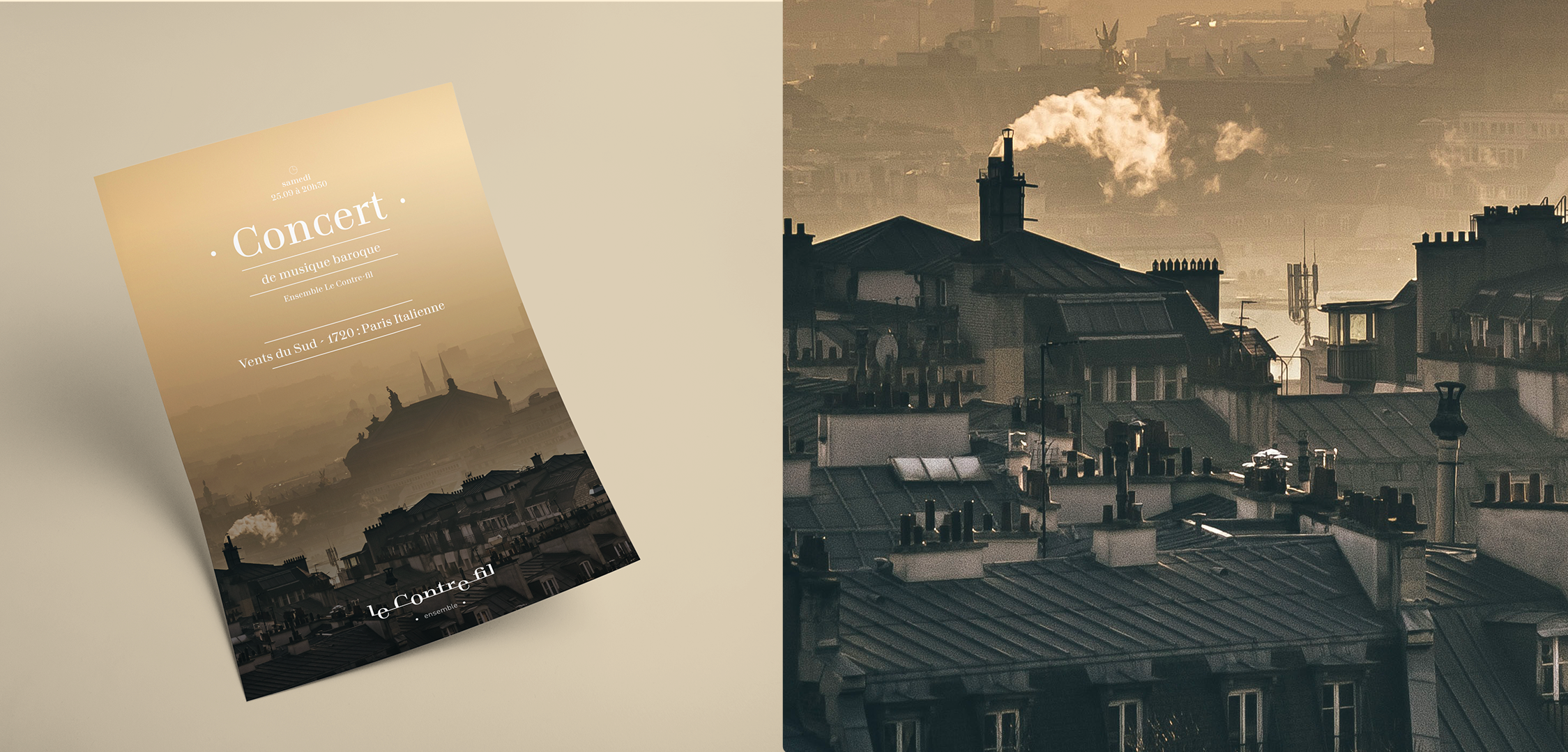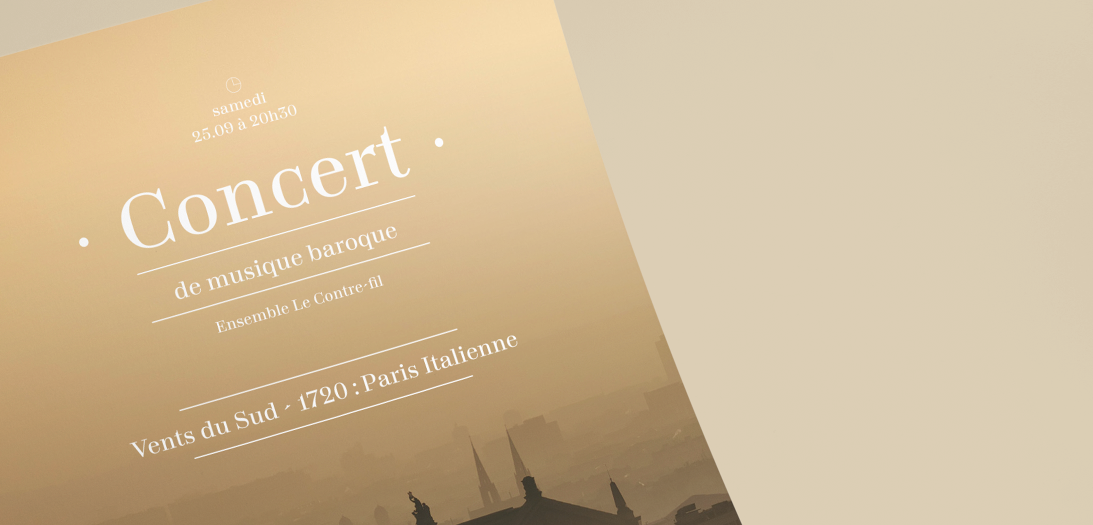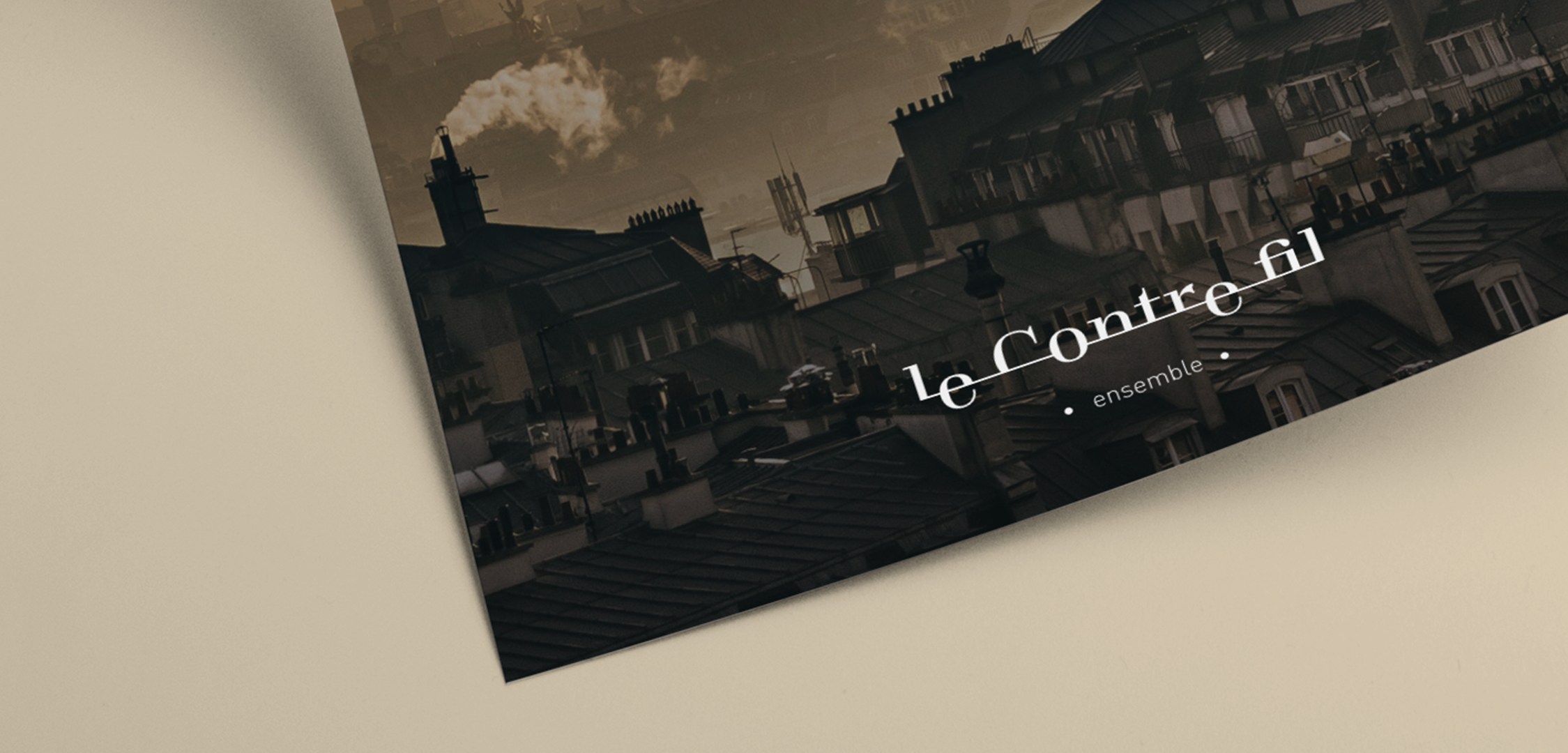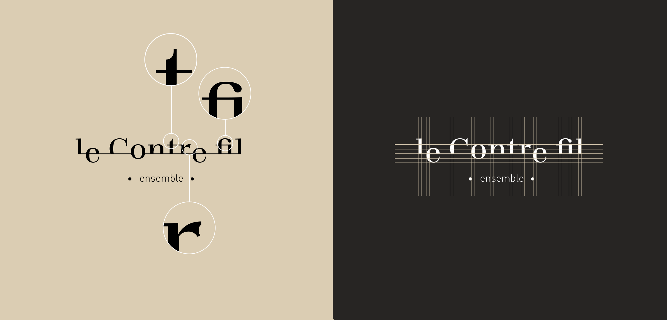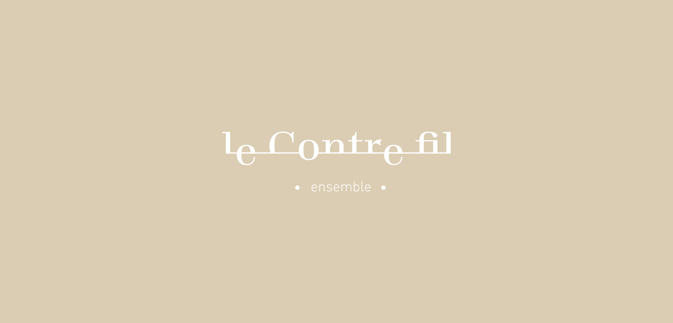 Le Contre-fil est un ensemble baroque monté et dirigé par Mathieu Dupont. Il est composé essentiellement d’instruments à vents. Le logotype utilise la typographie Totentanz de Yoann Minet (Bureau Brut), que j’ai choisi pour sa qualité mais aussi pour la terminaison de l’ascendant du “t” qui rappelle le bec d’une flûte, ainsi que le “r” dont la virgule a quelque chose de très végétal et baroque qui contraste avec un ensemble très stable.